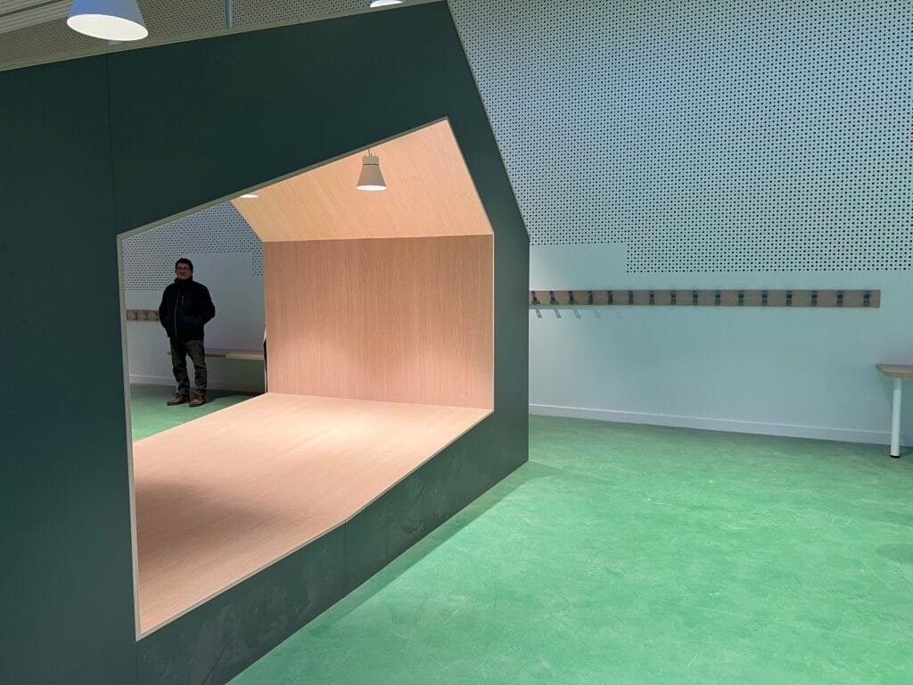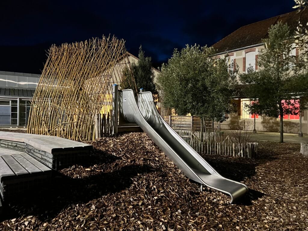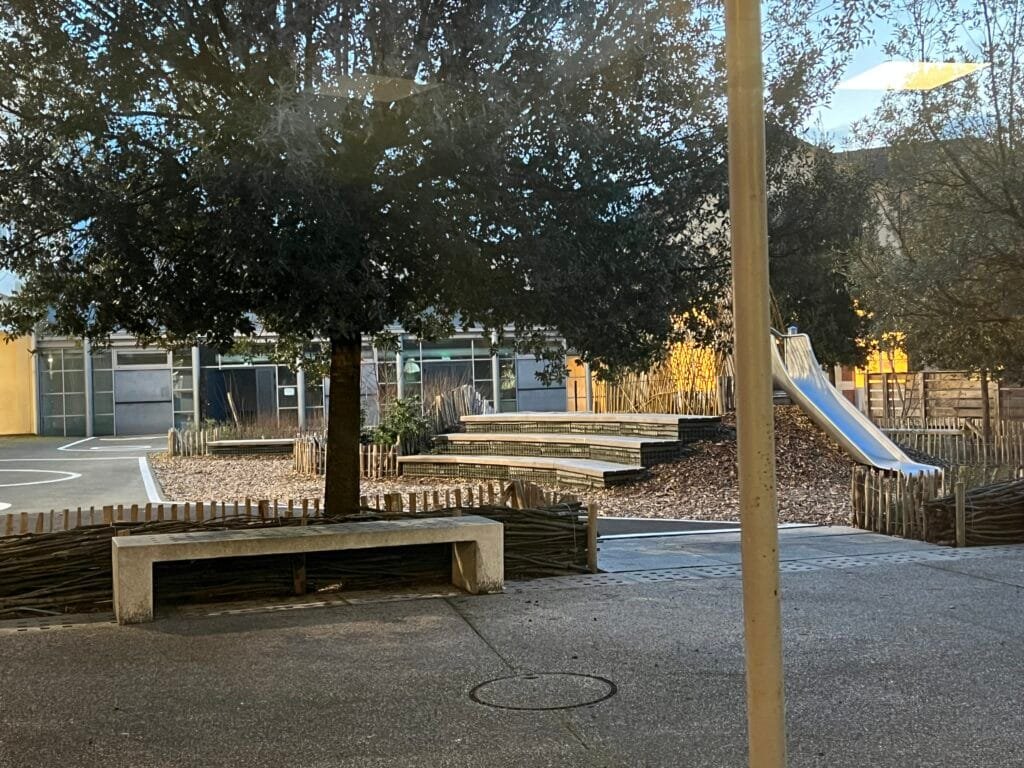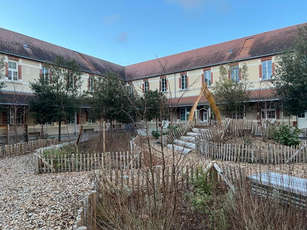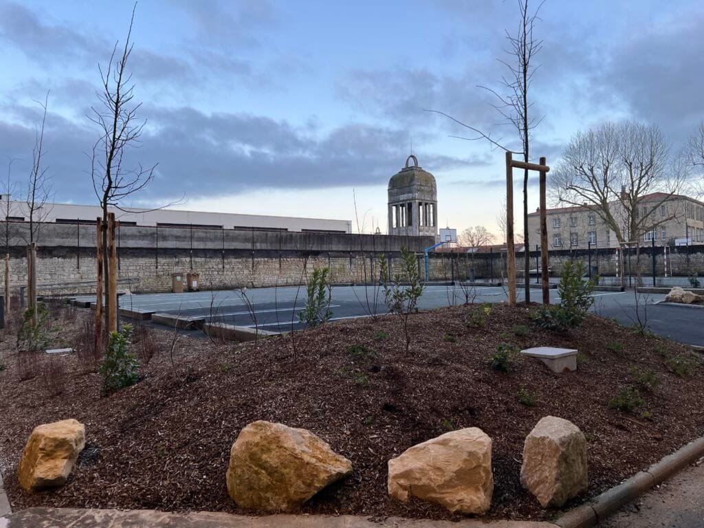 Dans la cour, une cour oasis végétalisée a été créée pour offrir un espace de jeu et de détente en pleine nature. « Les enseignants pourront aussi organiser des cours en extérieur », ajoute Fabienne Parpaillon. Tous les arbres et plantes choisies sont non toxiques pour les enfants.
